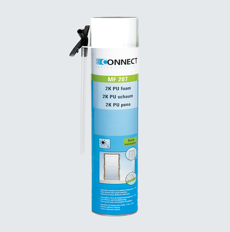 MF 207 2K Montažna pena je namenjena za hitro polnjenje, zapiranje, izoliranje reg in vrzeli na celotni stavbi in tudi na drugih področjih. Utrjena ima zelo dobre toplotne, zvočne, izolacijske, zlasti pa mehanske lastnosti. Formira močno vez na številne materiale. Posebej je primerna za vgradnjo notranjih vrat in zapolnjevanje globokih reg pri gradnji kabin, hladilniških panelov, na strehah,… Sistem za strjevanje ne potrebuje vlage iz zraka, zato je potrebna 2 komponenta, ki se nahaja na dnu pločevinke. Po aktiviranju druge komponente, je na voljo cca 5 minut za izpraznitev pločevinke, sicer se strdi v pločevinki. Pena je zelo hitro suha za rezanje že po 15 minutah.